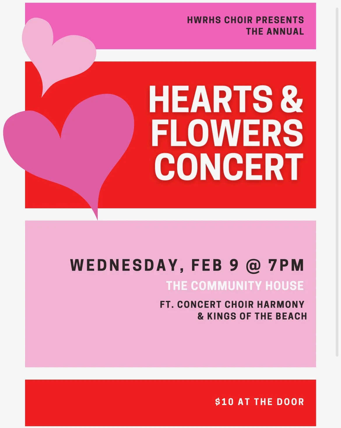 We are so looking forward to this year's Hearts and Flowers Concert, featuring Concert Choir, Dell Belles, Harmony, and Kings of the Beach, Wednesday, Feb. 9, 7 p.m., at The Community House. Tickets are $10 each at the door. For more information, please reach out to Ms. Simko.